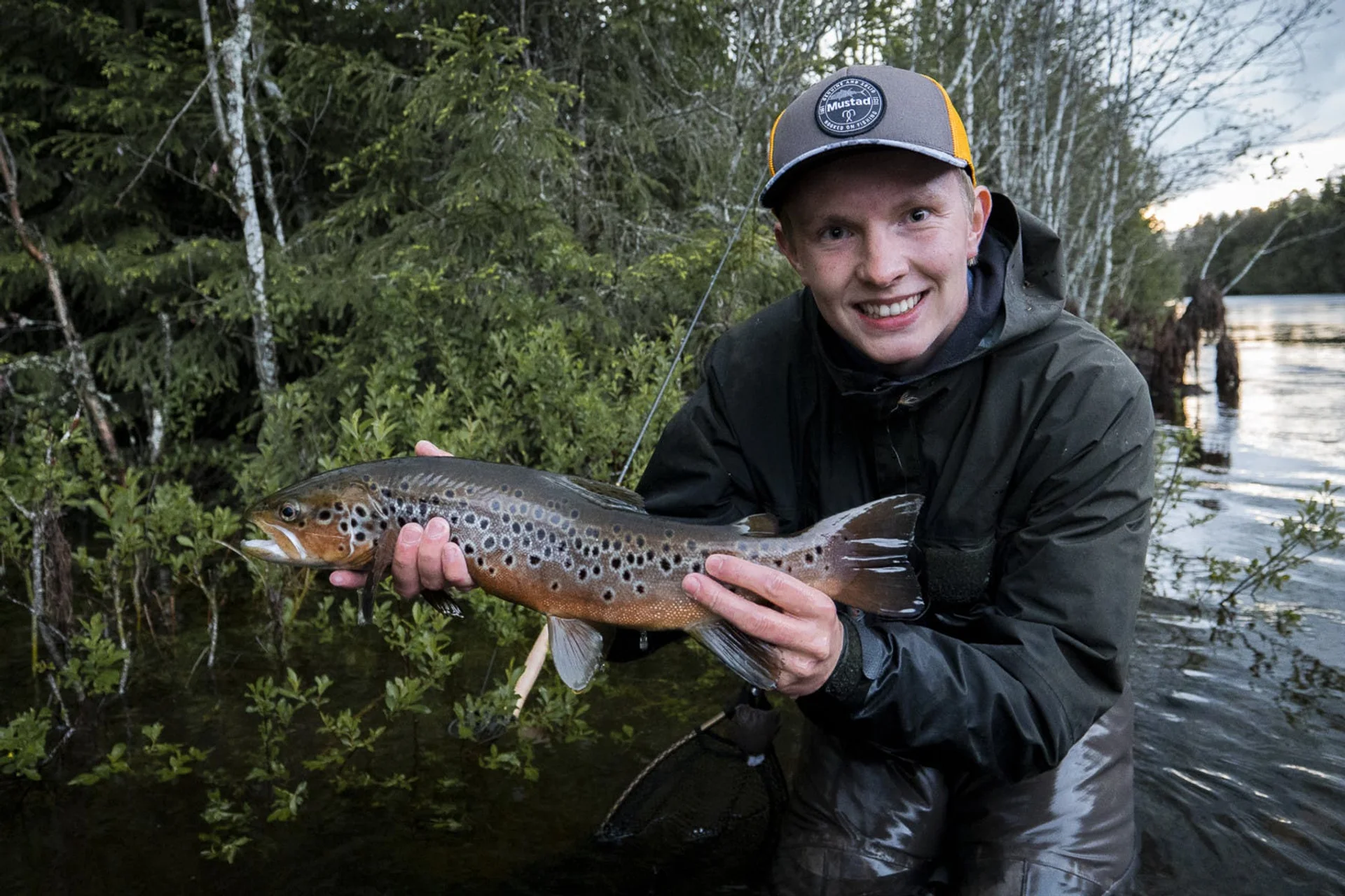 Under årets første tur til Renaelva opplevde vi slike forhold. Vi så flere store ørreter tett på land, men de viste ikke interesse for hverken små eller store tørrfluer. Dermed måtte vi tenke utenfor boksen. Da var det kjekt å ha en synkeline og en tung og stor Wooly Bugger i sekken. I le av mørket listet jeg meg innpå en av fiskene som hadde stilt seg opp under et tre langs elvebredden. Jeg la flua noen få meter ovenfor fisken, og idet flua passerte, åpnet ørreten munnen. Tilslaget satt og fisken raste nedstrøms. Etter en strabasiøs ferd nedover elven fikk vi omsider landet fisken. Wooly Buggeren, bundet på en Mustad R74NP-BR, satt fint i fiskens munnvik. Ørreten på 1,5 kilo ble raskt fotografert før den ble igjenutsatt.
